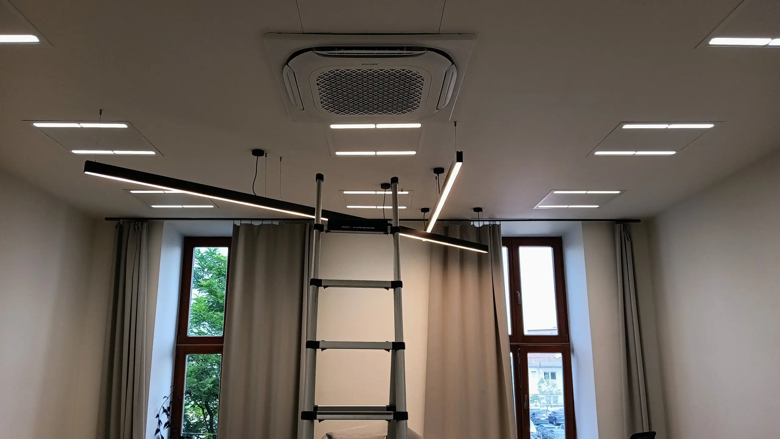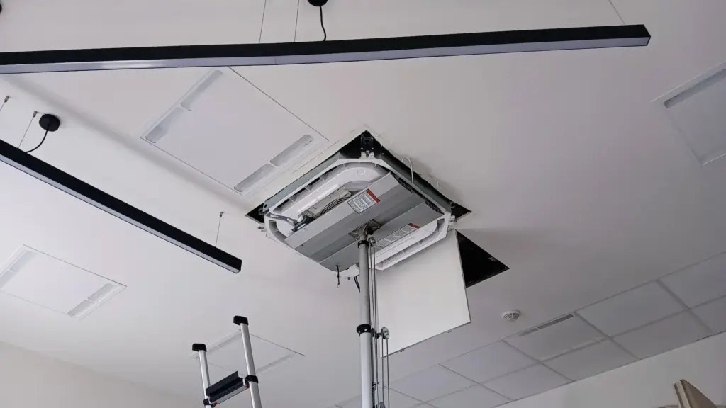 Kancelářská budova, Brno – Sinclair Montáž kazetových fancoilových jednotek (FCU), čtyřtrubkový systém. Jednotky značky Sinclair poskytují efektivní chlazení i vytápění, ideální pro kancelářské prostory. Čtyřtrubkový systém umožňuje současné topení a chlazení v různých místnostech a flexibilní individuální regulaci teploty. Kazetové provedení zajišťuje nenápadnou integraci do stropního podhledu a rovnoměrné rozdělení vzduchu.